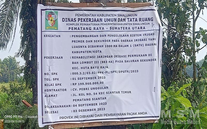 Adapun proyek pekerjaan untuk pembuatan tembok saluran irigasi primer maupun sekunder yang terletak saluran irigasi bah lombut III Nagori silakkidir kecamatan Huta bayuraja sumber Dana ,anggaran pendapatan belanja daerah (APBD) kabupaten Simalungun tahun anggaran 2023 melalui dinas pekerjaan umum dan tata ruang.