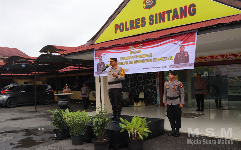 MediaInvestigasiMabes, Kalbar – Polres Sintang, AKBP Dwi Prasetyo, S.I.K memberikan penghargaan kepada personel yang berprestasi dalam upacara yang dilaksanakan di halaman Polres Sintang, Senin pagi (13/11/23).