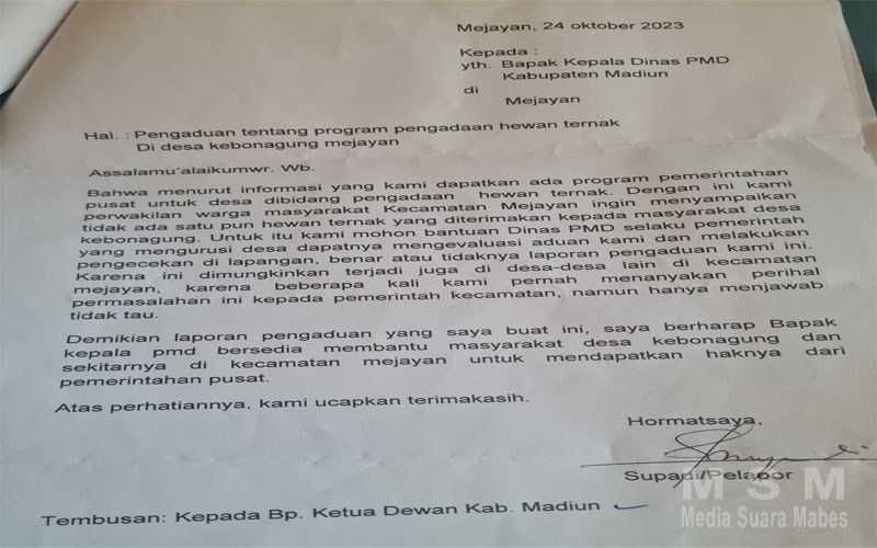 Pada isi surat yang beredar disebutkan bahwa dicurigai adanya ketidaktransparanan pada beberapa item program yang dilaksanakan Di Desa itu sehingga menggerakkan perwakilan warga untuk melakukan pengaduan kepada Dinas PMD Kabupaten Madiun Kejaksaan Negeri Kabupaten madiun Ketua DPRD hingga Kapolda jawa timur.
