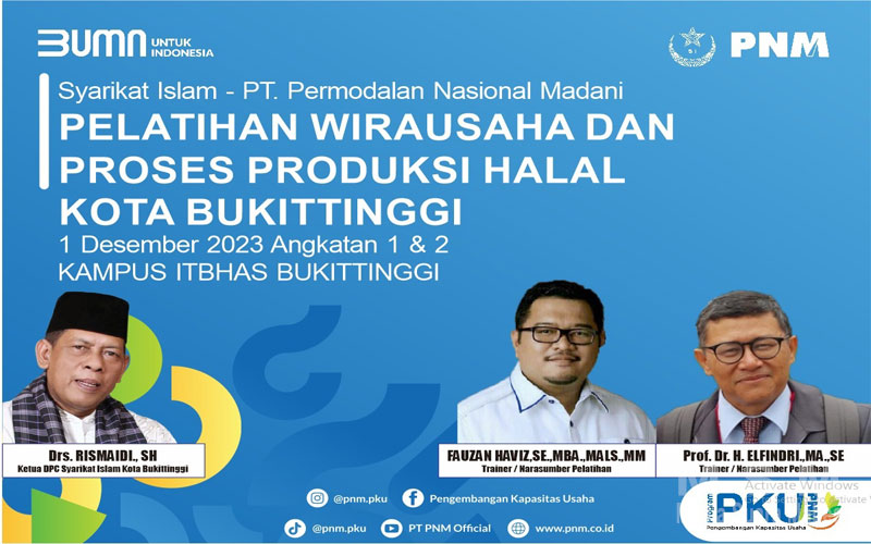 Tepat pada tanggal 1 Desember 2023 yang bertempat di ITBHAS Bukittinggi akan dilaksanakan Pelatihan Kewirausahaan dan Proses Produksi Halal kerjasama antara DPC Syarikat Islam Kota Bukittinggi dengan salah satu BUMN PNM ( Permodalan Nasional Madani _red ) dengan 100 nasabah binaan Mekar PNM dari pagi sampai sore yang dibagi menjadi dua angkatan.
