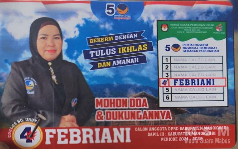 Salah satu caleg Partai Nasdem ialah FEBRIANI yang berkompeten di Kabupaten Manokwari, FEBRIANI mendaftarkan diri sebagai caleg DPRD dari Daerah Pemilihan (Dapil) lll . Nomor Urut 4.