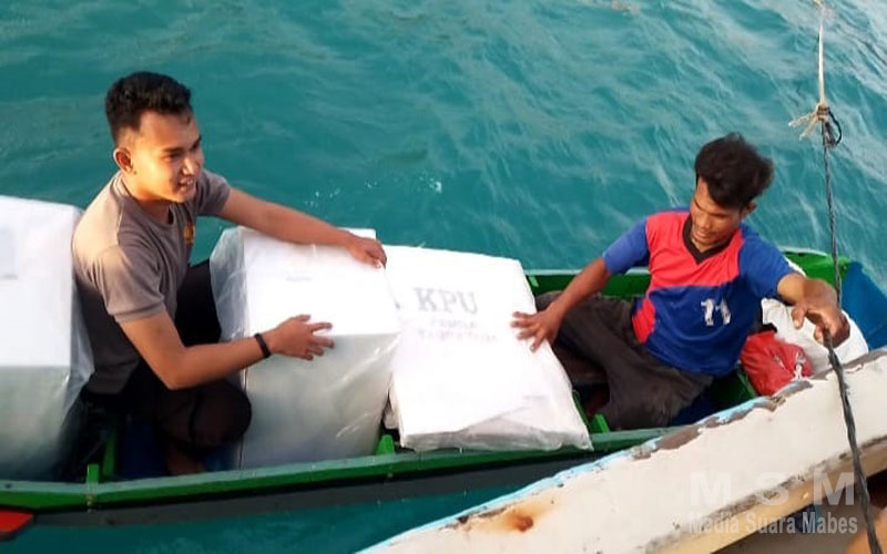 MediaInvestigasiMabes, Beltim – Personel Polres Belitung Timur yang melakukan pengamanan TPS di Pulau Batun membantu membawa kotak suara menuju daratan pulau itu dengan menggunakan sampan karena perahu nelayan tidak bisa berlabuh di pinggir pulau dikarenakan tidak ada dermaga.