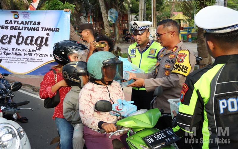 Sementara Kasat Lantas Polres Beltim AKP Abdul Haris mengatakan selain membagikan makanan dan minuman untuk berbuka puasa gratis, Sat Lantas Polres Beltim juga menyampaikan pesan-pesan Kamtibmas di bidang lalu lintas yaitu menghimbau masyarakat pengguna jalan, baik pengendara sepeda motor maupun mobil.