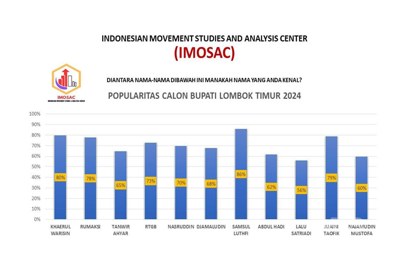 Menurut Direktur Risert Indonesia Movement Studies And Analysis Center (IMOSAC), Yasin Jaelani, berdasarkan temuan IMOSAC di lapangan, Popularitas tertinggi bakal calon Bupati Lombok Timur Anggota DPR RI Dapil NTB 2 Fraksi Partai Nasdem dan merupakan Mantan Wakil Bupati Lombok Timur, HM. Syamsul Luthfi, SE.,M.Si.