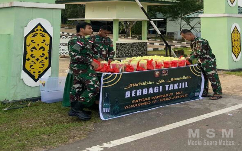 Dalam kegiatan tersebut, personel Pos Kotis Satgas Pamtas RI-MLY Yonarmed 10/ Bradjamusti yang dipimpin oleh Pasi intel Satgas Lettu Arm Dhamis beserta anggota, tidak melihat dari suku, ras, dan agama apa pun takjil tersebut tetap diberikan kepada setiap pengendara di jalan yang melintas. Terlihat berbagai kalangan masyarakat antusias menerima takjil yang diberikan oleh anggota.