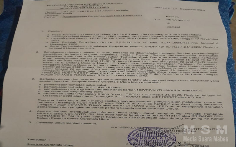 MediaInvestigasiMabes, Gorut – Mirisnya dengan pihak aparat penegak hukum (APH) sektor tolinggula pantai dan khususnya polres gorut. Kabarnya sudah setahun lebih sampai saat ini kasus pencabulan anak di bahwa umur belum terungkap,Korban yang masih duduk di bangku SMP kelas XI ini berinisial NZ. Selesa 7/5/2024.