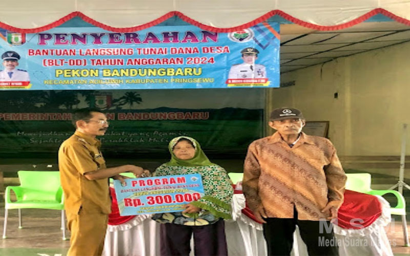 MediaInvestigasiMabes, Pringsewu – Bantuan Langsung Tunai di berikan secara simbolis oleh Kepala Pekon Bandung baru Slamet Riyadi kepada warga penerima bantuan di Aula Pekon Selasa 14 /05/24.