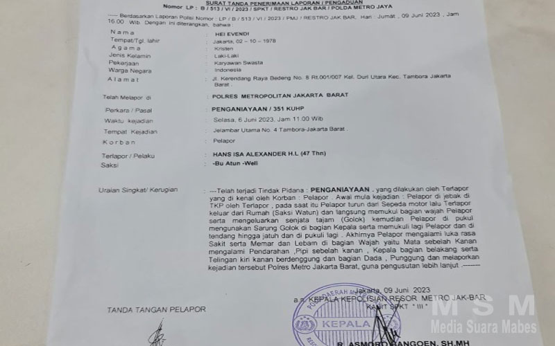 Sebelumnya Hei Evendi yang menjadi korban pemukulan dia melaporkan kejadian tersebut ke polres metro Jakarta barat. Ia mengatakan bahwa kejadian pemukulan perampasan dan perusakan dengan membawa senjata tajam terjadi di Jelambar Utama IV No 81 RT 01 RW 08 Grogol Petamburan Jakarta Barat usai kejadian tersebut Ia kemudian melaporkan kejadian tersebut ke polres metro Jakarta barat dengan nomor laporan LP/B/513/VI/2023/SPKT/RES JAK BAR/PMJ, tanggal 09 Juni 2023′.”Usai kejadian itu esoknya saya melapor ke polres karena ini penganiayaan yang sangat membahayakan bagi saya dan bisa nyawa saya hilang”. Katanya kembali