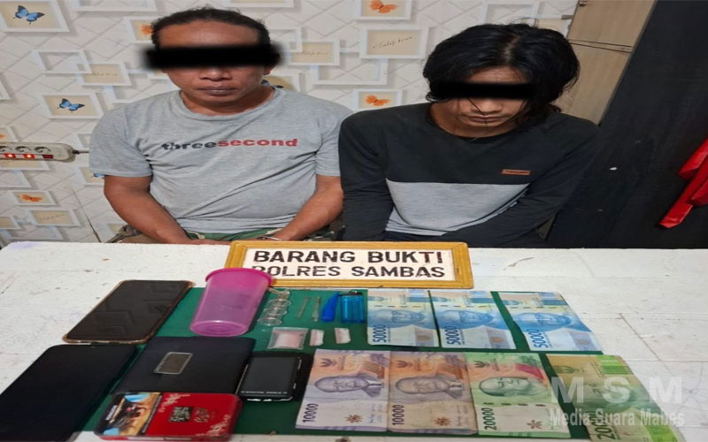 Yang mana bahwa tempat tersebut sering dijadikan tempat transaksi jual beli narkotika jenis sabu-sabu, yang kemudian perintah kasat resnarkoba kepada anggota satresnarkoba polres sambas bersama anggota Unit Reskrim Polsek Pemangkat berkoordinasi untuk melakukan penggerebekan di sebuah rumah yang beralamat di Jl. Teluk Nusa RT. 004 RW. 010 Ds. Harapan Kec. Pemangkat Kab. Sambas. Dan didapati Sdr. UJ Als MJ dan Sdr. M. FD Als IK, kemudian dilakukan penggeledahan badan dan rumah tersebut dan dapati 1 (satu) buah kotak rokok merk “GUDANG GARAM” warna merah yang berisikan 2 (dua) paket plastik klip transparan berisikan butiran kristal putih yang diduga narkotika jenis shabu, 1 (satu) buah toples merk ”TUPPERWARE” warna pink yang berisikan 1 (satu) buah BONG, 1 (satu) buah korek api gas warna biru, 1 (satu) bungkus plastik klip kosong, 1 (satu) buah sendok pipet warna biru, 2 (dua) buah tabung kaca, 1 (satu) buah timbangan digital merk ”DIGITAL SCALE” warna hitam, 1 (satu) buah dompet warna hitam yang berisikan Uang sejumlah Rp.210.000 (dua ratus sepuluh ribu rupiah) dengan pecahan Rp.50.000 (lima puluh ribu rupiah) 3 (tiga) lembar, Rp. 20.000 (dua puluh ribu rupiah) 2 (dua) lembar, Rp. 10.000 (sepuluh ribu rupiah) 2 (dua) lembar, 1 (satu) buah handphone merk “VIVO Y20S” warna Biru dan 1 (satu) buah handphone merk “OPPO A16” warna Silver. Selanjutnya tersangka berikut barang bukti dibawa ke Mapolres Sambas untuk proses lebih lanjut.