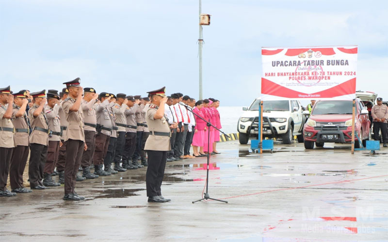 MediaInvestigasiMabes, Waropen – Kepala Kepolisian Resor Waropen AKBP. Iip Syarif Hidayat, S.H., bertindak selaku Inspektur Upacara Tabur Bunga dalam rangka memperingati Hari Bhayangkara Ke 78 Tahun 2024 di Polres Waropen, yang bertempat di Dermaga Pelabuhan Laut Pidemani, Distrik Urei Faisei, Kabupaten Waropen, Kamis (27/06/2024).