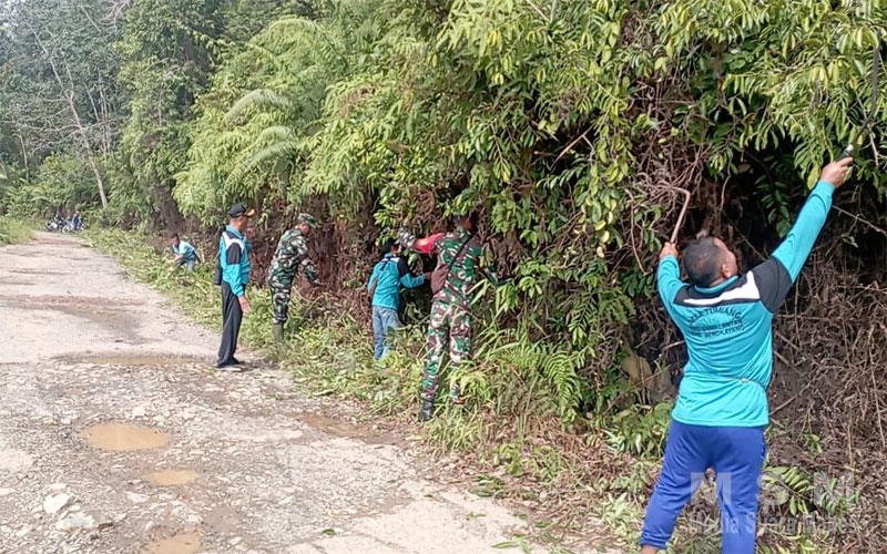 “Kerja bakti ini dilakukan, karena kondisi kiri kanan jalan mulai ditumbuhi rerumputan ditambah lagi ranting pepohonan mulai menutupi jalan, sehingga pandangan pengendara sedikit terhalang dan apabila hal ini dibiarkan tidak menutup kemungkinan bisa terjadi Laka Lantas,” ujarnya.