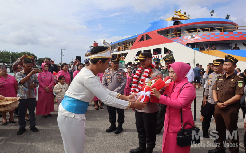 Kedatangan Kapolres Kepulauan Talaud dan istri disambut langsung oleh Wakapolres Kepulauan Talaud Kompol Barthol Bawole bersama sejumlah PJU.
