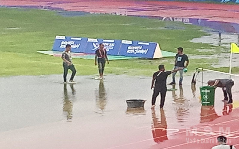Para panitia pon terlihat sibuk melakukan berbagai cara untuk mengeringkan lapangan termasuk menggunakan cetak cor yang terbuat dari triplek untuk mendorong air ke area pinggir lapangan dan juga dengan cara menyedok air menggunakan gayung lalu di tuangkan ke dalam ember, hal itu juga turut di bantu oleh tim dari kesebelasan papua dan Riau sebelum pertandingan di lanjutkan kembali pada jam 18.15 sore.