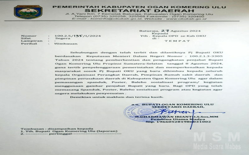 MediaInvestigasiMabes, Baturaja – Pemerintah Kabupaten oku sudah resmi mengeluarkan intruksi untuk melepaskan alat peraga pj bupati oku bapak Tedy meilwansah yang ikut mencalonkan diri sebagai bupati oku periode 2024_2029 jumat 27/9/2024