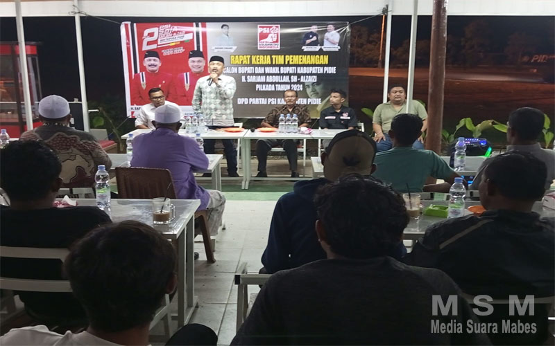 MediaInvestigasiMabes (MSM Group), Aceh – Ketua PSI DPD Kabupaten Pidie melakukan Rapat Kerja Tim untuk pemenangan Paslon “SaJa”,Eri Sukma mengungkapkan sejalan dengan perintah DPW PSI Aceh pihaknya siap bergerak dan berjuang untuk memenangkan pasangan calon (Paslon) Bupati dengan jargon ‘SaJa’ (Sarjani-Alzaizi) Minggu malam (19/10/24).