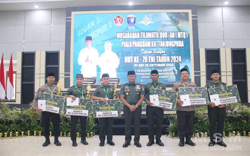 MediaInvestigasiMabes (MSM Group), Kubu Raya – Pangdam XII/Tanjungpura Mayjen TNI Iwan Setiawan, S.E., M.M., secara resmi menutup lomba Musabaqah Tilawatil Qur’an (MTQ) Piala Pangdam XII/Tanjungpura dalam rangka memperingati hari ulang tahun ke-79 TNI tahun 2024 di Aula Sudirman, Makodam XII/Tpr, Sungai Raya, Kubu Raya, Rabu (23/10/2024).