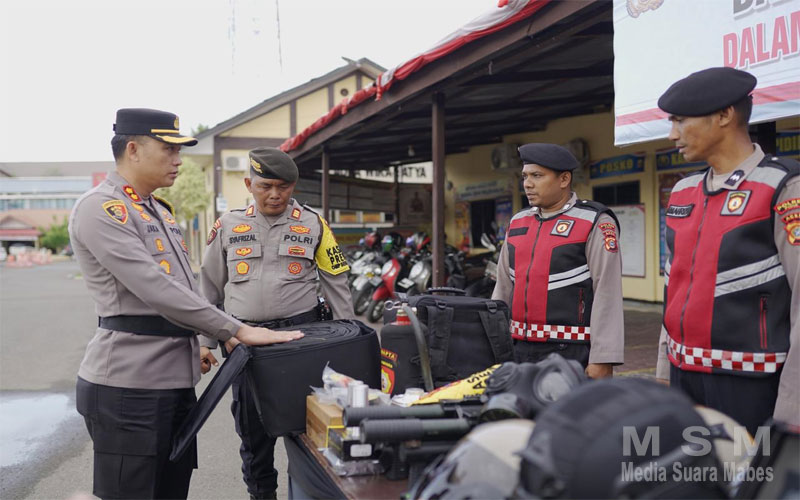 Adapun peralatan yang dicek meliputi kendaraan roda dua DRX Trail, kendaraan roda empat Double Cabin Dmax, kendaraan roda enam AWC, serta perlengkapan Dalmas lainnya seperti plontar, flas ball, APAR, tali Dalmas, helm, tameng, tongkat, dan baju pelindung.