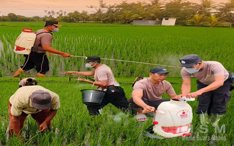 Kapolsek Kawasan Pelabuhan Gilimanuk, Kompol I Komang Muliyadi, S.H., M.M., memimpin kegiatan perawatan dengan penyemprotan tanaman dan pemupukan padi di lahan persawahan Desa Baluk, Kecamatan Negara, Kabupaten Jembrana.