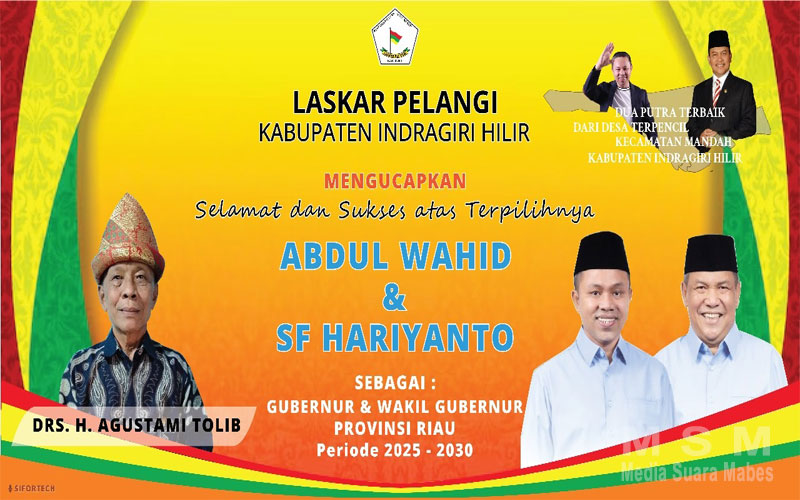 MediaInvestigasiMabes (MSM Network), Kab. Indragiri Hilir – Drs. H. Agustami Tolib, Ketua Laskar Pelangi Kabupaten Indragiri Hilir, mengucapkan selamat kepada Abdul Wahid yang terpilih sebagai Gubernur Riau untuk periode 2025-2030. Dalam pesan ucapan tersebut, beliau berharap agar Abdul Wahid dapat menjalankan amanah dengan sebaik-baiknya dan membawa Riau menuju kemajuan yang lebih gemilang, mengikuti jejak kesuksesan mantan Gubernur Riau, Rusli Zainal, yang telah banyak berkontribusi dalam pembangunan provinsi ini.