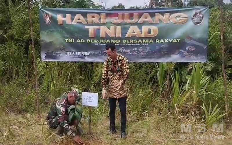 MediaInvestigasiMabes (MSM Network), Bengkayang – Kodim 1209-02/Sgu Ledo Peringati Hari Juang TNI AD Ke-79 melibatkan anggota Kodim 1209/Bky berkolaborasi Forkopimcam menanam pohon jenis tengkawang di perkarangan kantor camat Sanggau Ledo,Desa.Lembang Kec. Sanggau ledo Kab.Bengkayang. Minggu (15/12/24).