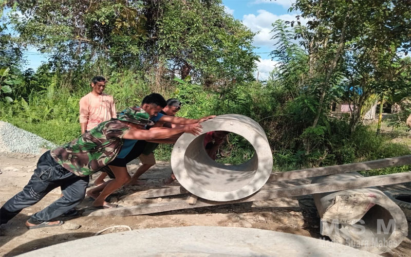 Personil satgas TMMD dan masyarakat terlihat kompak bekerja sama menurunkan gorong gorong yang nantinya akan di pasang guna menghubungkan saluran air sehingga ketika hujan turun tidak menghambat akses jalan.
