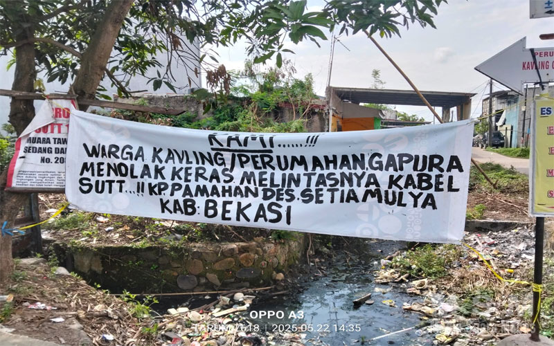 MediaSuaraMabes, Bekasi – Warga di Desa Setia Mulya, Kecamatan Tarumajaya, Bekasi menghalau proyek penarikan kabel untuk Saluran Udara Tegangan Tinggi (SUTT). Aksi warga ini telah berlangsung selama dua hari sejak kemarin hingga hari ini, Sabtu, 17 Mei 2025.