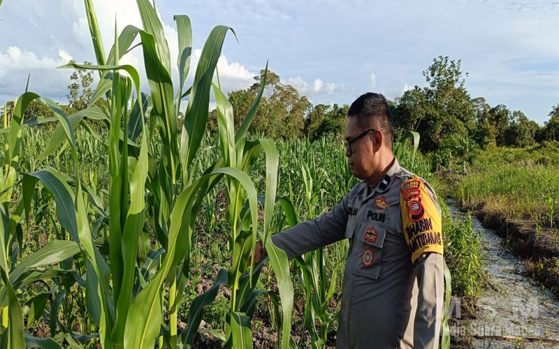MediaSuaraMabes, Ketapang — Bhabinkamtibmas Polsek Muara Pawan, Aipda Herland, melaksanakan kegiatan pengecekan perkembangan tanaman jagung hibrida di lahan tumpang sisip milik Kelompok Tani Muara Makmur yang terletak di RT 12, Dusun Kali Baru, Desa Sungai Awan Kiri, Kecamatan Muara Pawan, Kabupaten Ketapang.