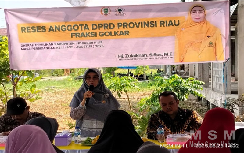 MediaSuaraMabes, Kab. Indragiri Hilir – 26 Juni 2025 Anggota DPRD Provinsi Riau dari Fraksi Partai Golkar, Hj. Zulaikhah, S.Sos., M.E., melaksanakan kegiatan reses masa persidangan ke-III tahun 2025 di Kabupaten Indragiri Hilir, Rabu (26/6). Kegiatan ini menjadi wadah penting bagi masyarakat untuk menyampaikan langsung aspirasi dan permasalahan yang mereka hadapi di daerah masing-masing.