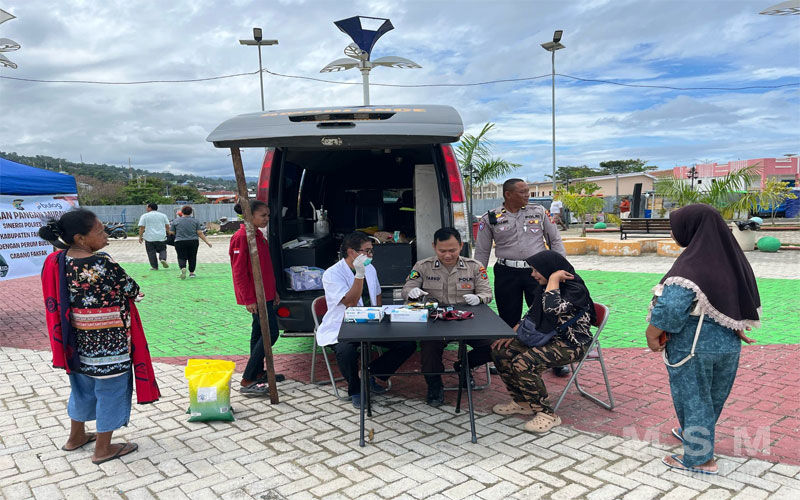 Selain menyediakan bahan pangan pokok dengan harga terjangkau, Polres Fakfak juga menghadirkan pelayanan kesehatan gratis melalui Mobil Klinik Polres Fakfak. Pemeriksaan kesehatan dan pengobatan gratis ini dipimpin oleh dr. Indra Sully, M.P.H., guna memberikan manfaat langsung bagi masyarakat.
