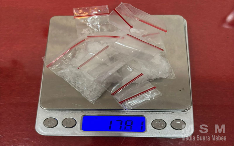 “ Disaksikan oleh perangkat RT setempat, kami mengamankan pelaku RF serta sejumlah barang bukti berupa 10 kantong klip transparan berisi serbuk kristal diduga narkotika jenis sabu dengan berat total 17,81 gram brutto, 1 buah alat hisap sabu bong, 2 buah pipet modifikasi sendok sabu, 1 buah Handphone, 1 unit sepeda motor merk Vario serta Uang tunai 3.570.000 rupiah ” Tambah Aris.