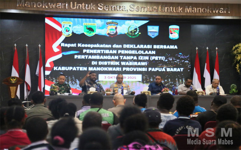 MediaSuaraMabes, Manokwari Papua Barat – Kepolisian Daerah Papua Barat menunjukkan keseriusan dalam menangani aktivitas Pertambangan Tanpa Izin (PETI) yang marak terjadi di Distrik Wasirawi, Kabupaten Manokwari. Langkah konkret itu diwujudkan melalui kehadiran Kapolda Papua Barat Irjen Pol Johnny Eddizon Isir, S.I.K., M.T.C.P., pada Rapat Kesepakatan dan Deklarasi Bersama Penertiban Pengelolaan Pertambangan Tanpa Izin (PETI) yang berlangsung di Aula Sasana Karya, Kantor Bupati Manokwari, Jumat (3/10/2025).