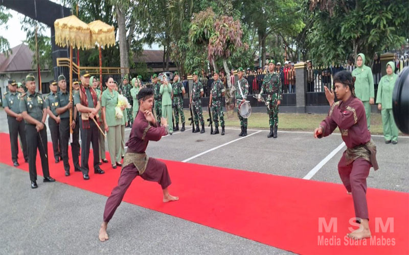 Kehadiran petinggi Pejabat Utama Makodam XX / TIB tersebut juga dalam penyambutannya dihadiri langsung Dandim 0304/Agam Letkol inf Slamet Dwi Santoso., S.IP ditandai pengalungan kain songket dan buket bunga, tari pasambahan siriah carano, serta Pangdam XX / TIB menyerahkan bingkisan paket sekolah secara simbolis pada sepasang anak prajurit.
