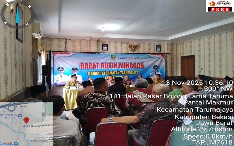 MediaSuaraMabes, Tarumajaya – Dalam rangka persiapan pembangunan Gudang dan Kantor KDMP (Koordinator Desa Mitra Pembangunan), Pemerintah Kecamatan Tarumajaya menggelar rapat minggon bersama para kepala desa se-Kecamatan Tarumajaya, Kamis (13/11/2025).