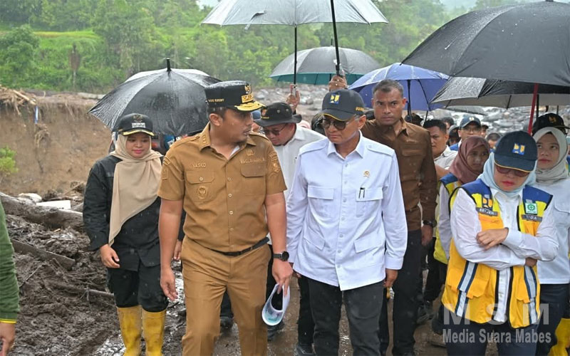 MediaSuaraMabes, Agam — Wakil Gubernur Sumatera Barat (Wagub Sumbar), Vasko Ruseimy mendampingi Menteri Pekerjaan Umum RI, Dody Hanggodo meninjau langsung sejumlah infrastruktur yang rusak akibat bencana hidrometeorologi di Sumbar, Senin (8/12/2025). Peninjauan dilakukan untuk memastikan percepatan penanganan kerusakan jalan dan jembatan di lokasi-lokasi terdampak paling parah.