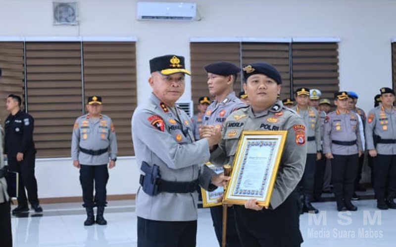 Diakhir kegiatan, Kapolda Banten Irjen Pol. Hengki memberikan penghargaan kepada dua personel Ditpamobvit Polda Banten yang berhasil meringkus pelaku penyelundup narkoba jenis sabu seberat kurang lebih 5 kilogram melalui jalur pengamanan X-ray di Pelabuhan Bakauheni, Lampung pada tahun 2025. (Bidhumas).